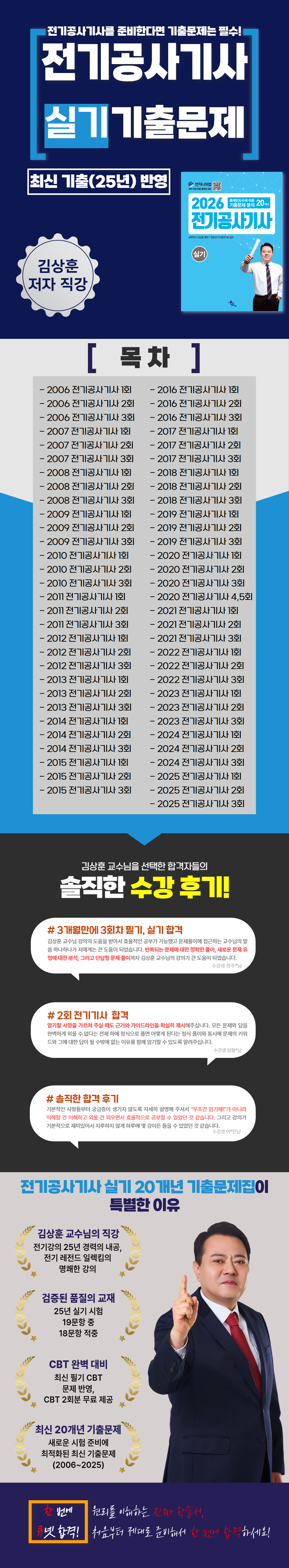 2006년~2025년까지 20년 동안의 모든 기출문제를 수록한 26년 개정판입니다. 한국전기설비규정(KEC)의 최신 개정안을 반영하여 문제의 풀이와 정답을 수정하고 KEC 개정으로 인해 삭제된 문제 대신 KEC 내용에 맞는 신규 문제를 새로이 수록하였습니다. 저자 직강 동영상 강의, 실기 이론 비법서, 파이널 특강+단답형 등의 교재와 함께 전기공사기사 합격을 위한 최적의 솔루션을 제공합니다.